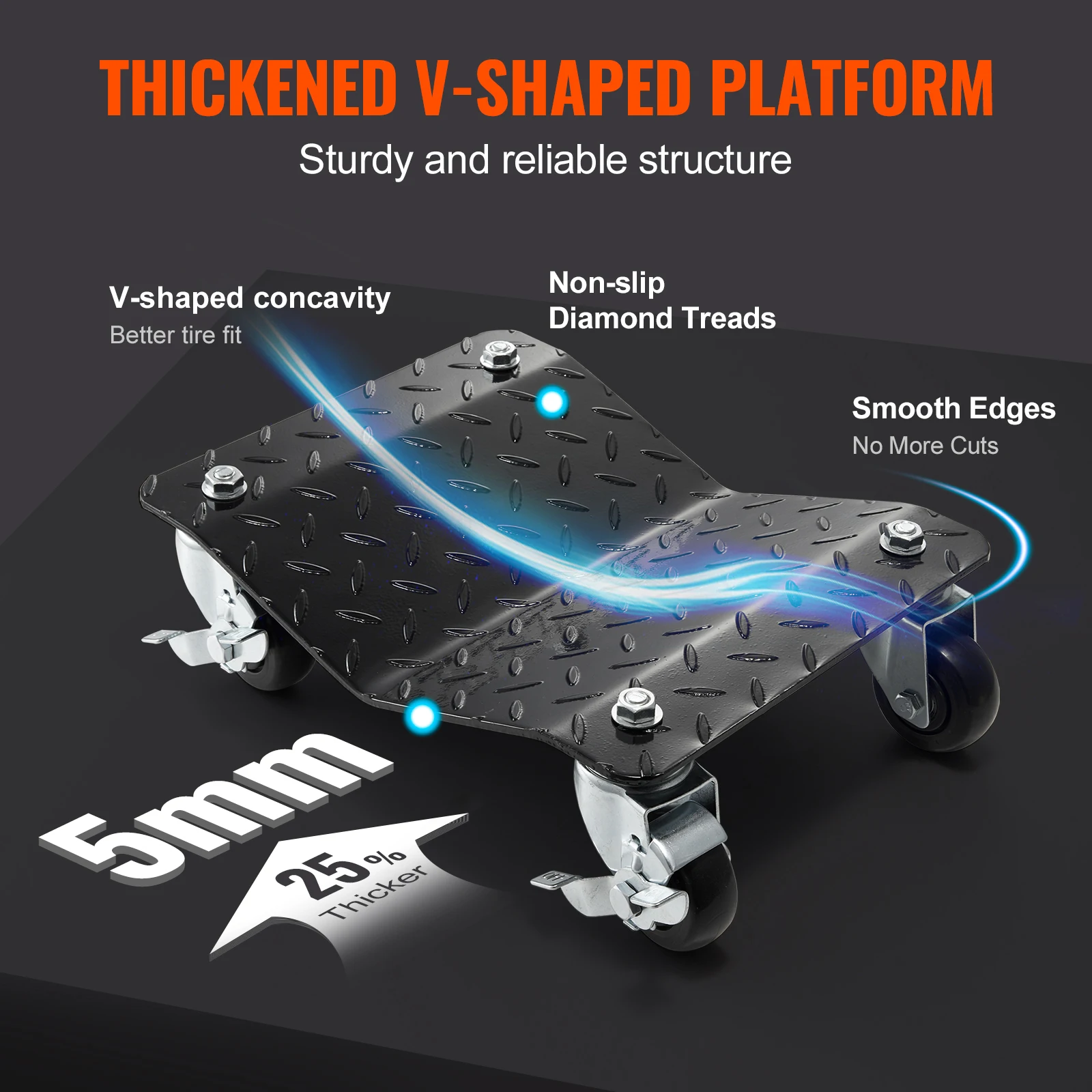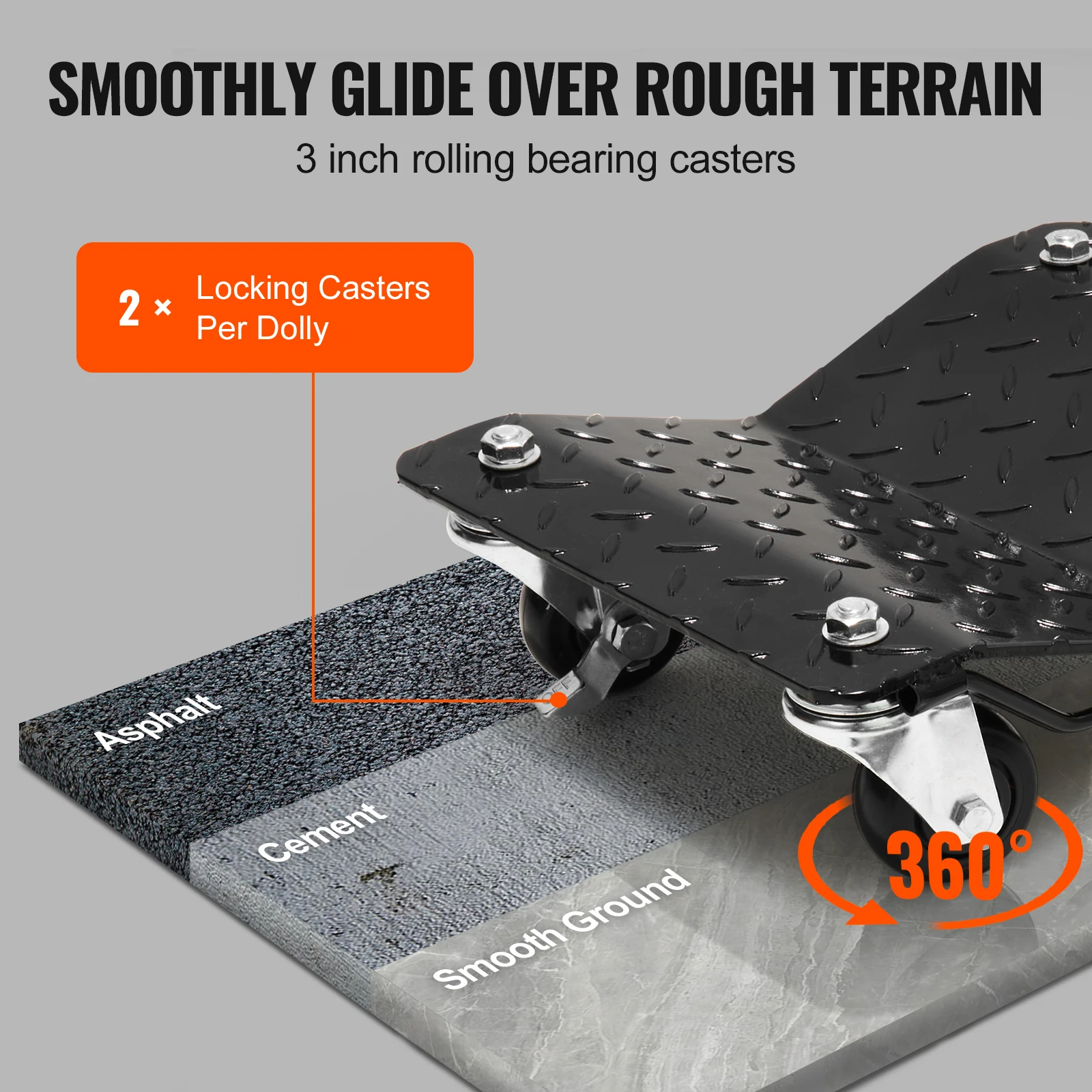 Versatile Application: Ideal for a range of vehicles, including family cars, large SUVs, pickups, ATVs, and tractors, this dolly accommodates tires up to 12 inches / 305 mm in width. It's perfect for moving cars, changing tires, and other maintenance tasks.Sturdy and Durable: Built with thickened steel panels, this wheel dolly supports up to 1,500 pounds per unit, with a combined capacity of 3,000 pounds (2 pcs). Its robust construction ensures durability and resilience even under the weight of heavy SUVs.